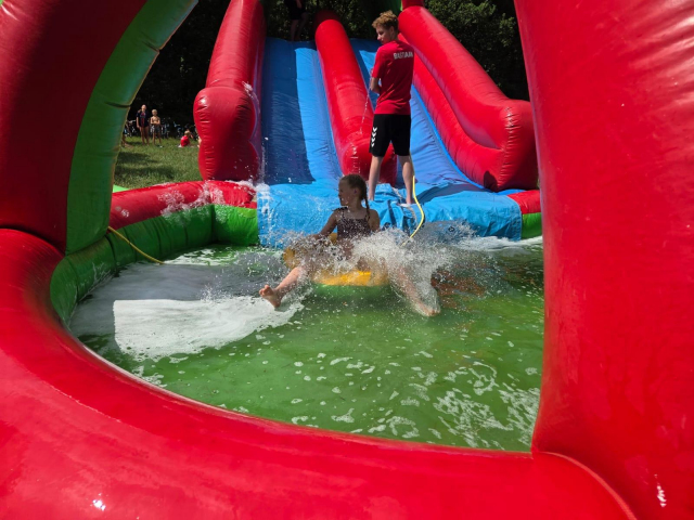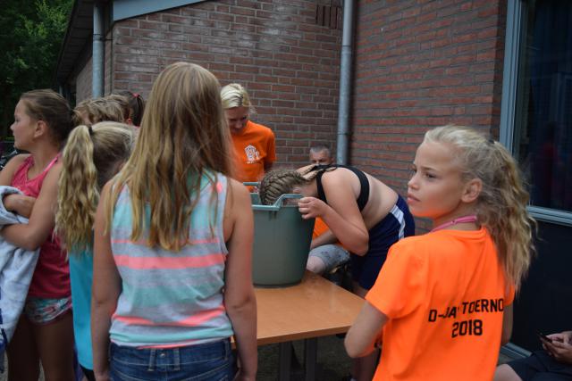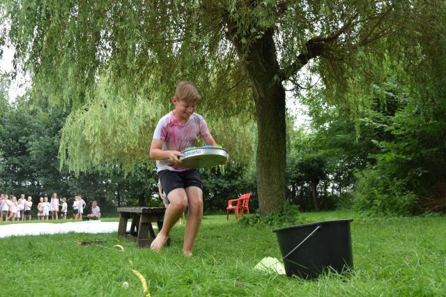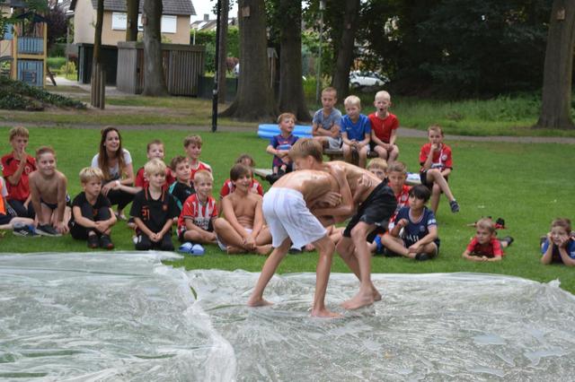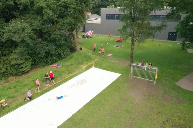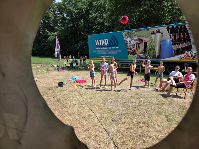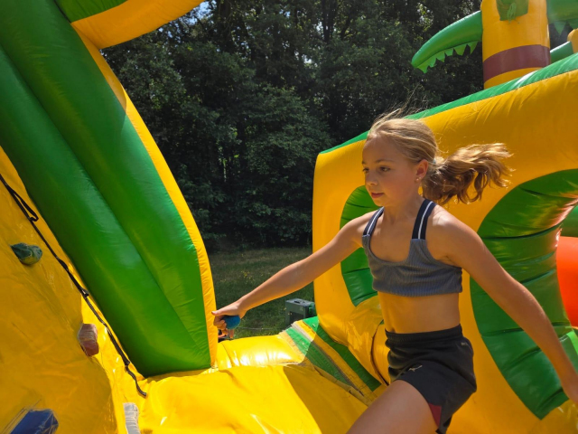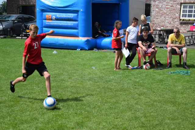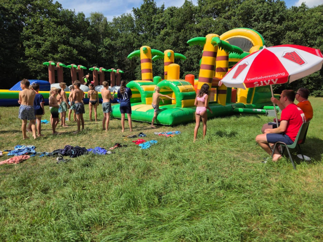 De dag begon met de zeskamp. We hadden 3 grote luchtkussens: jungle run, bouncing balls en de tobbedansbaan. Daarnaast hadden we raketwerpen, glijhonkbal en luchtbed schuiven. De zeskamp werd gewonnen door