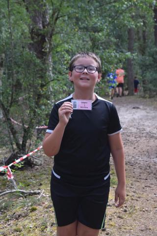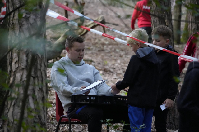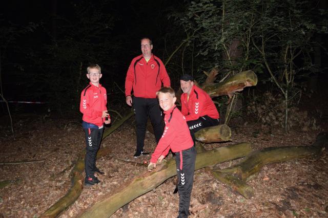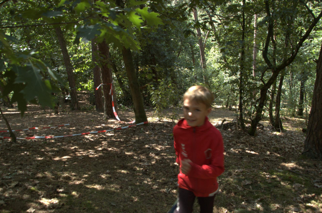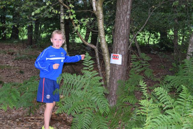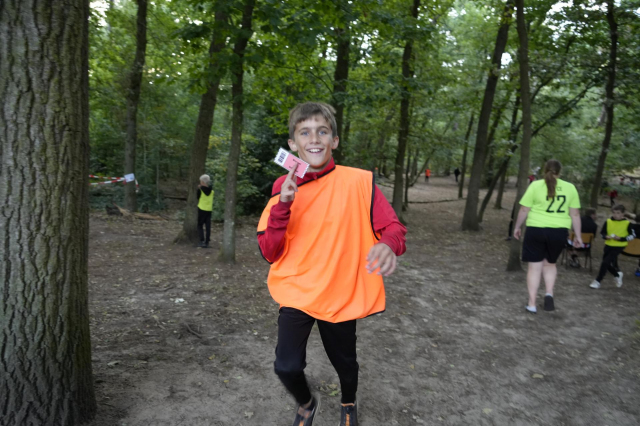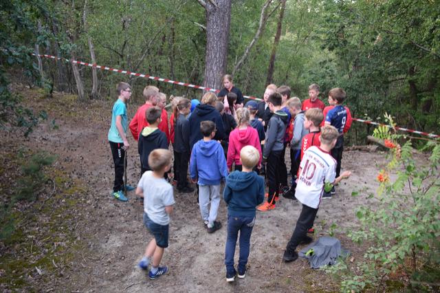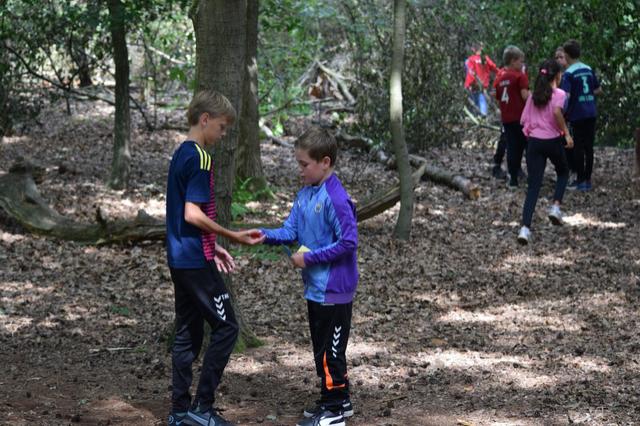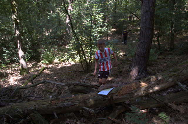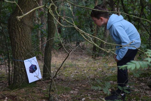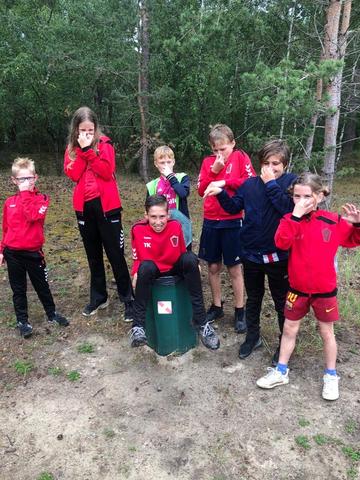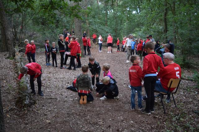 De kinderen gingen 1 voor 1 het bos in. Hier mochten ze zoeken naar platen. Op de platen stond een afbeelding, een nummer en een teken.. We mochten de platen kris kros door elkaar zoeken, maar we kwamen wel vaak dezelfde kaarten tegen. De zin die we moesten maken luidt als volgt: Een zak snoep en een bal bij SJVV is het er allemaal!