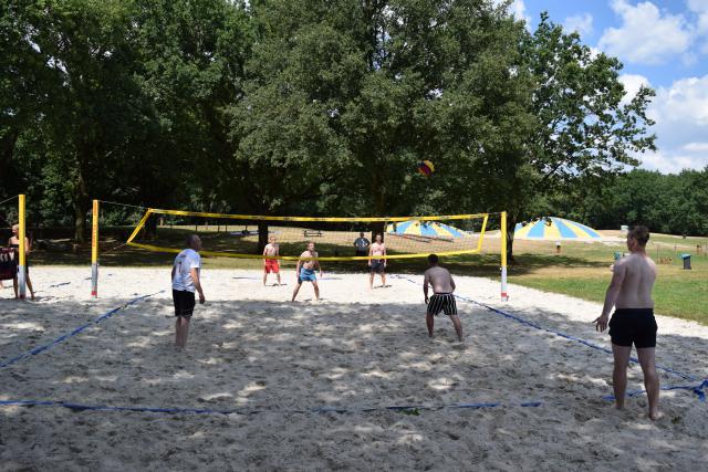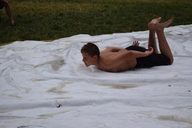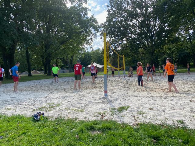 We hadden het spel glijhonkbal. Bij dit spectaculaire onderdeel is het de bedoeling om na het trappen van de strandbal zo snel mogelijk bij het honk te komen. Dit doe je niet rennend, maar vooral schuivend!