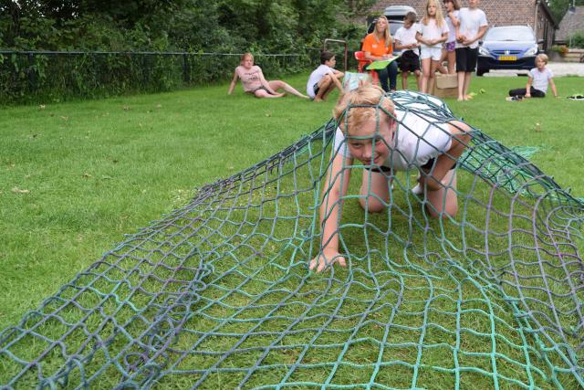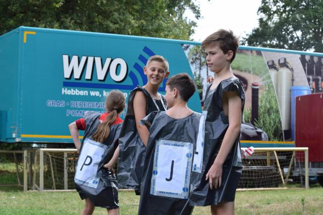 Het openingsspel met: containerschieten, 3 op een rij, het koptelefoonspel, cornhole met dank aan Gert Nooijen en de teamvlag maken. Bij het containerschieten, scoorden de kinderen 1 punt onderin en 2 punten aan de zijkanten, 5 punten in het midden en 10 bovenin met een raak schot. Het koptelefoonspel, hilarisch nieuw onderdeel. De jongen of het meisje met de koptelefoon moest het liedje zingen dat hij/zij hoorde, de andere kinderen moesten dan raden welk liedje het was. Bij de cornhole gooien 2 teams om beurten met pittenzakjes. Blijft het pittenzakje liggen op de plank is het 1 punt, gaat hij zelfs door het gat, dan scoort het team 3 punten. De vlaggen werden gemaakt in het thema 'candykamp'.