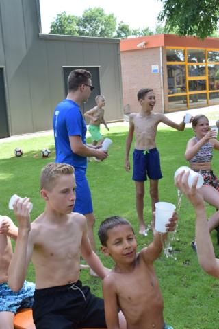 watertransport: over ons hoofd doorgeven van een bekertje water, terwijl degene die achter je zit het water moet proberen op te vangen.