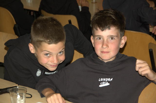 Gisterenavond hebben we groentesoep, aardappels, roomschijven, boontjes en erwtjes & worteltjes gegeten. Dat was lekker. Daarna hadden we even wat vrije tijd en geoefend voor de bonte avond. We gaan een quiz doen en Fabian is de presentator. Team 1 is Bart, Niek en Daan en team 2 is Noortje, Tim en Quinten. 'S Avonds hadden we de quiz. We hadden zeven rondes. De eerste ronde was vragen beantwoorden, toen in de tweede ronde moest je logo's raden van voetbalclubs in Nederland. Dit onderdeel hadden we gewonnen. In de derde ronde hadden we foto's raden, dat was best wel makkelijk. In de vierde ronde hadden we schansspringen op de computer. Fabian was hier tweede geworden. De vijfde ronde was 'wat schat Nederland?'. Hier kreeg je een vraag en moest je een percentage invullen van hoe Nederland er over denkt. Hiervan mocht je 15% afwijken. In de zesde ronde kregen we vijf verschillende kleine opdrachten. In de zevende ronde konden we de fiches die we gewonnen hadden in de eerste zes rondes inzetten in het Gemerts casino. In het casino konden we black jack, dobbelen, hoger/lager en roulette spelen. In totaal waren we tweede geworden met de quiz. Daarna gingen we tanden poetsen en in ons bedje slapen. We hebben erg gelachen want sommigen vielen uit bed.