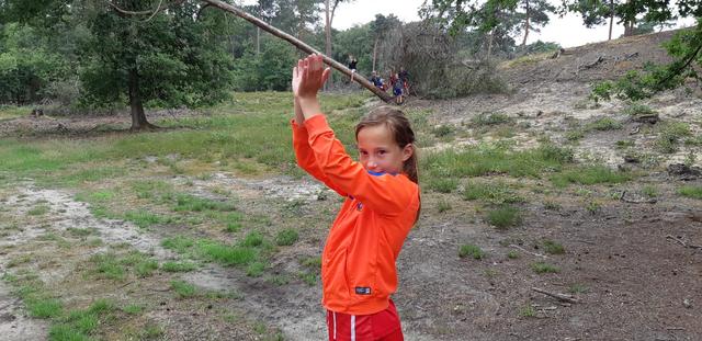 Vandaag gingen survivallen in het bos, tussen hoepels door, langs de bosjes en tijgeren, knie lopen, evenwigts balk, rollen, zaklpen, rennen, daarna kregen ze een worstenbroodje. En Bas en Kay hadden sinas up uitgevonden, ranja 7up.